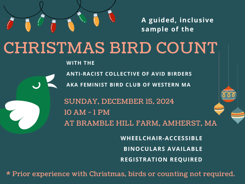 The Anti-Racist Collective of Avid Birders invites you to join the Christmas Bird Count taking place in the Hadley/Amherst area on Sunday, December 15, 2024. This Christmas Bird Count is more than just a tally of species; it's a celebration of inclusivity, community, learning, and appreciation for the natural world. No matter your experience, abilities or preferences, there’s a place for you in this century-long tradition of bird conservation.