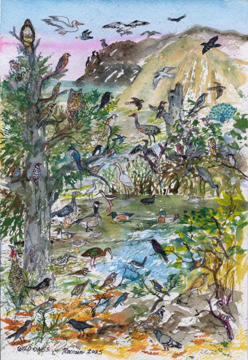 With only 5 hours left in our 24 hours, the driver said heading for the big big mountains was silly because it was far far away. So we went to a favorite place from last year's birdathon: Lake Solano and Putah Creek. “Where is everybody?” our driver muttered when the expected birdy spots were nearly silent. Well last year it was morning but now it was a hot afternoon so most critters were napping. We went up the river into shade and sat on rocks where everybody was mesmerized by churning noisy water. A young human came by and said it was a favorite spot so he joined us and became a highlight of the day. He was not surprised by us Wild Ones out of the house on a quest. He spoke of his long connection with nature and showed us a book from his pocket of magical writings and art that he was inventing.