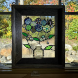 One-of-a-kind Original Rebecca Grills of Summer Glass, glass piece. Barnwood framed glass bouquet measuring 11.5 in x 13 in, using recycled and kiln fired materials.