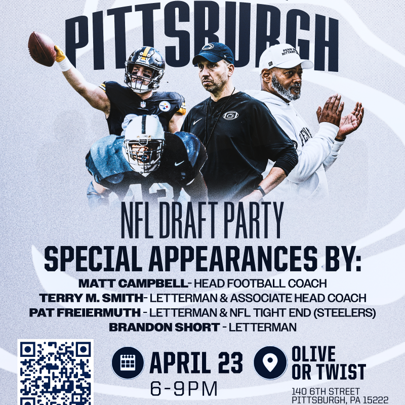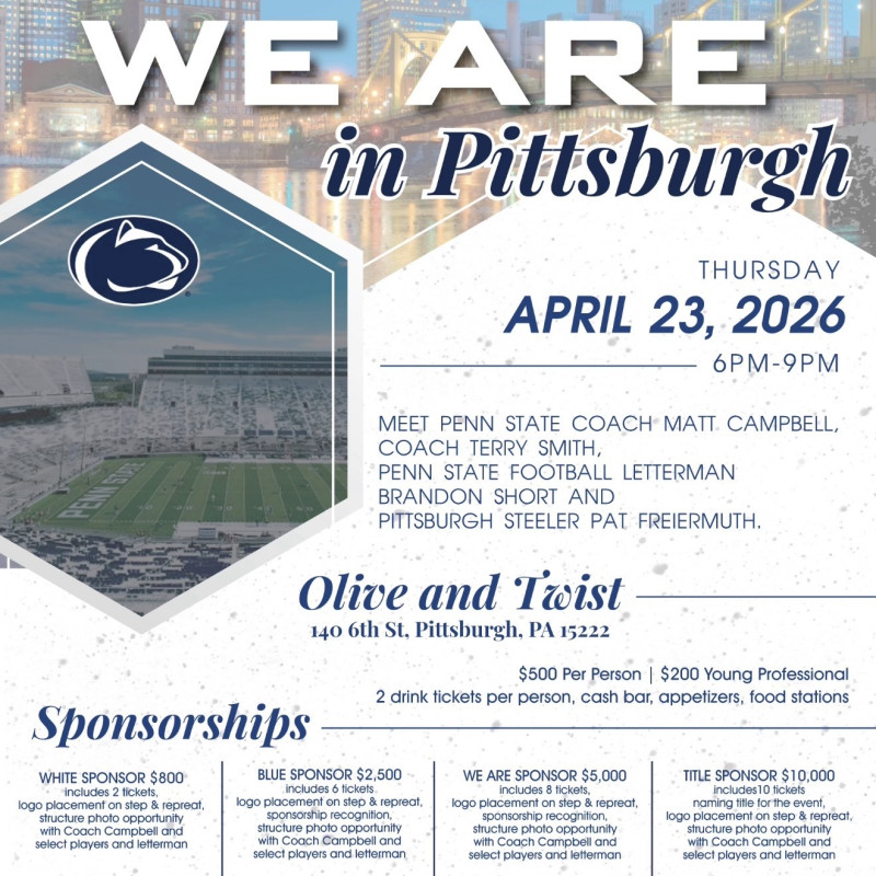 This event features Head Coach Matt Campbell, Coach Terry Smith, Penn State Football staff and notable Penn State Football lettermen including Brandon Short and Jordan Hill, and Pittsburgh Steeler, Pat Freiermuth, and current Penn State Football players in a structured, premium environment designed to unite the Penn State community in support of our Penn State Football student-athletes.